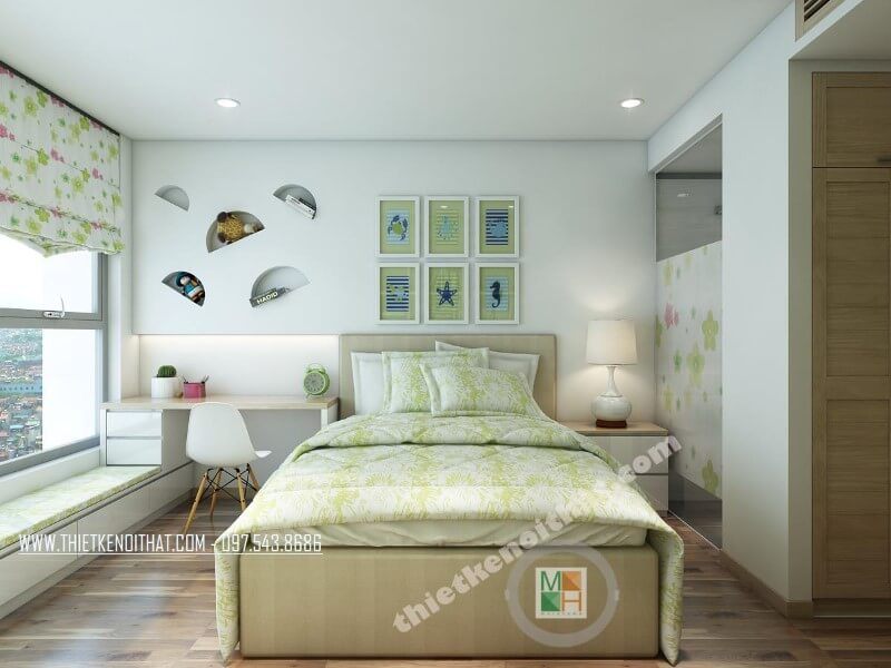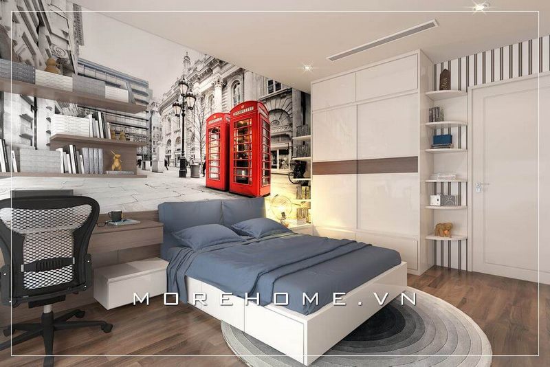 Thiết kế phòng ngủ bé trai hiện đại đầy ấn tượng, chiếc giường ngủ đa năng màu trắng, tủ quần áo cửa lùa, tranh dán tường ấn tượng...