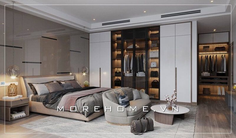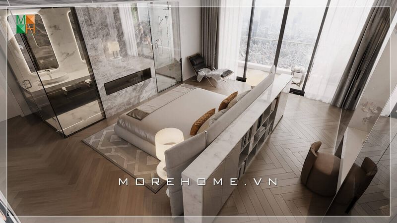Phòng ngủ master hiện đại có sự bố trí nội thất lạ mắt khi giường ngủ được đặt ở giữa phòng và được ngăn cách với khu để trang phục bằng một tủ kệ nhỏ ốp đá nhân tạo trắng vân mây. Ngoài ra, nhà tắm được đặt trong phòng giúp cho việc sinh hoạt trong phòng thuận tiện hơn.