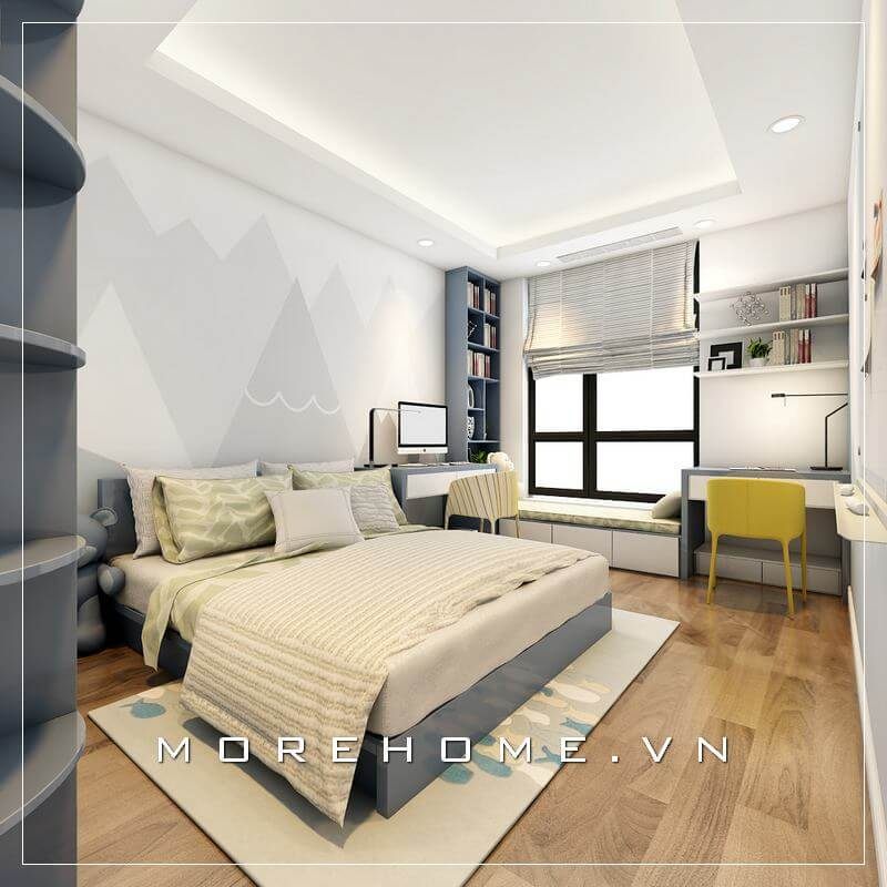 . Mẫu thiết kế nội thất phòng ngủ bé trai cho căn hộ hiện đại được làm nổi bật hơn bằng cách trang trí chữ "hi" với bóng đèn.